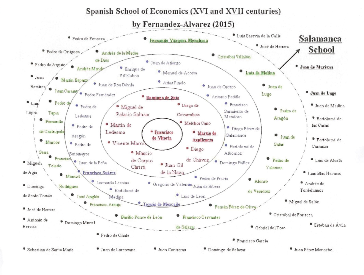 Francisco de Vitoria, la primera figura en iniciar este renovado interés por el pensamiento aristotélico y el pensamiento de Santo Tomás, para ese momento comenzando en 1526 en Salamanca, inicia una revolución en el pensamiento de la época. Vitoria inicia una escuela de pensamiento que influye en la monarquía hispana, que se encuentra en ese preciso instante tratando de discernir cosas tan importantes como, la humanidad de los indígenas descubiertos en las Américas unos años antes en 1492 por parte de Cristobal Colón. Los escolásticos discuten temas como la moralidad de tener o no propiedad, el libre albedrío o la libertad, la justicia de los intercambios y por lo tanto de los precios y la función que cumplían en el mercado. Comienzan a discutir tópicos como los efectos en España de las recaudaciones de impuestos, el quinto real que cobraba la corona. Otro fenómeno que discute es como el descubrimiento de las minas de plata en las Américas, cambiaba la cantidad de dinero circulante y por lo tanto generaban inflación al llegar a la península ibérica.
